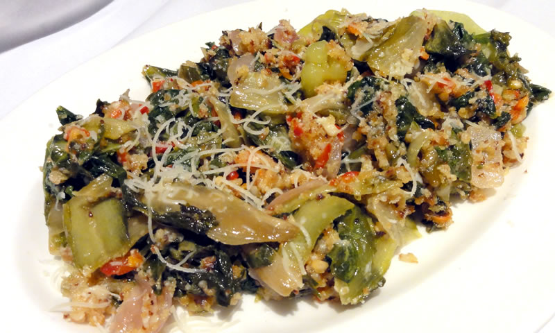 ½ cup grated Asiago cheeseDirections:Preheat oven to 400 degrees Fahrenheit Because escarole tends to be sandy, wash it thoroughly by filling the sink with cold water and swishing the leaves through the water. Drain the water from the sink and repeat the process twice more (or use pre washed escarole). Drain well and cut the escarole into 1-inch strips. In a large pot, bring 6 quarts of salted water to a boil, add the escarole and blanch for 2 minutes. Drain the pot and plunge the escarole into an ice bath (4 cups cold water, 4 cups ice) to stop cooking. Drain thoroughly. In a large skillet, heat ½ cup olive oil over medium heat. Add the onion and pancetta and cook for 5 minutes to soften. Do not brown. Increase heat to medium-high, and add the garlic. Sauté until lightly browned, then add the escarole, peppers, and chicken broth. Combine thoroughly and cook until escarole is wilted. Season with salt and pepper. Transfer the mixture to a 2-quart baking dish. In small bowl, combine the bread crumbs with 2 tablespoons of olive oil. Spread the moistened bread crumbs over the escarole, then sprinkle with Asiago. Bake until the cheese melts, about 15 minutes.